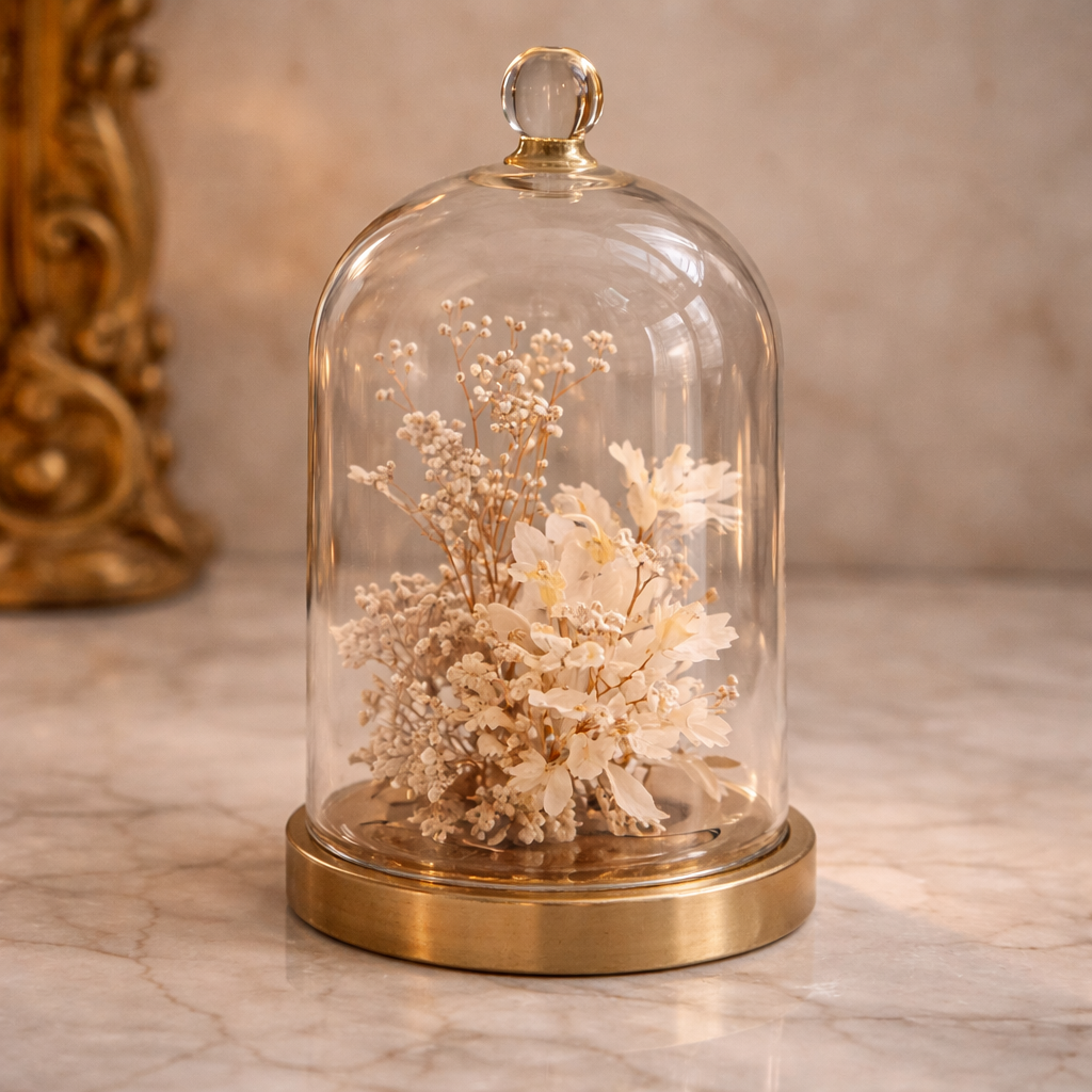 Contrairement aux fleurs fraîches, les fleurs séchées conservent leur charme pendant des années. Protégées sous leur cloche, elles deviennent une pièce décorative poétique qui apporte douceur et élégance à votre intérieur.